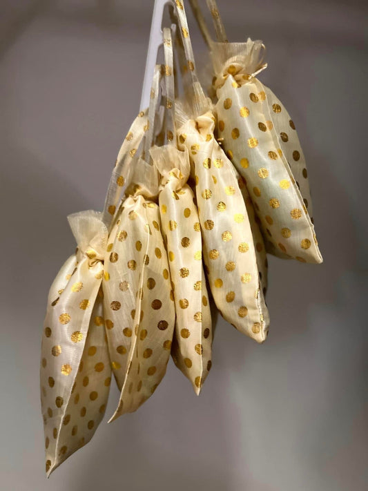 Silk Potli Bags with Peacock Feather & Polka Dot Design – Wedding & Jewelry Pouches