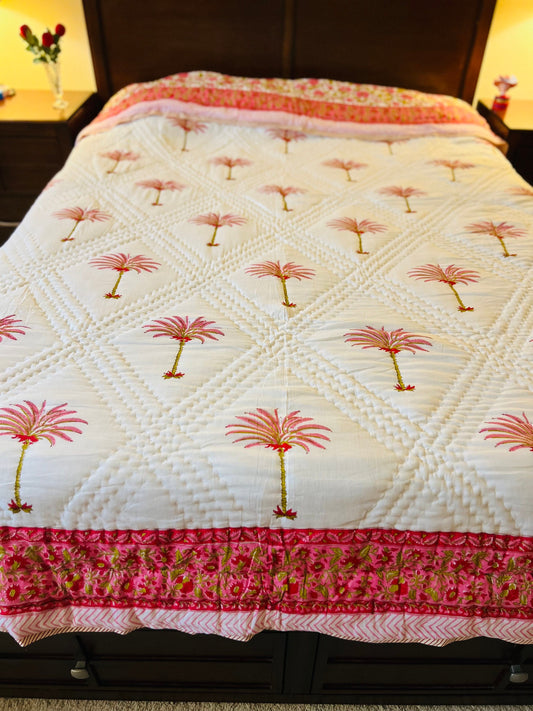 Reversible Block Print Floral Cotton Quilted Blanket – Queen Size