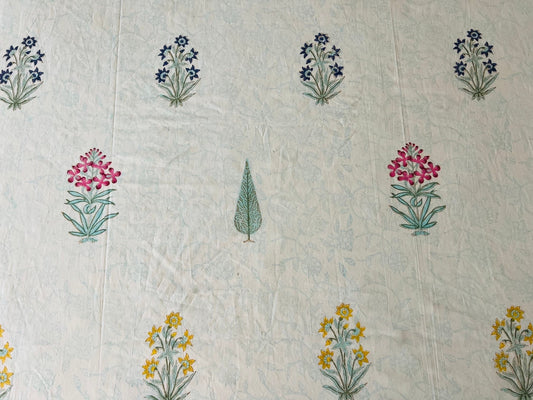 Handmade Floral Block Print Cotton Flat Bedsheet with 2 Reversible Pillow