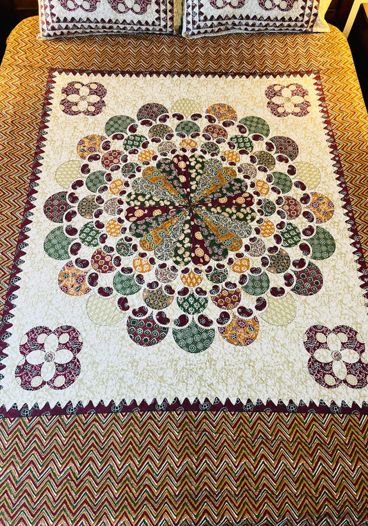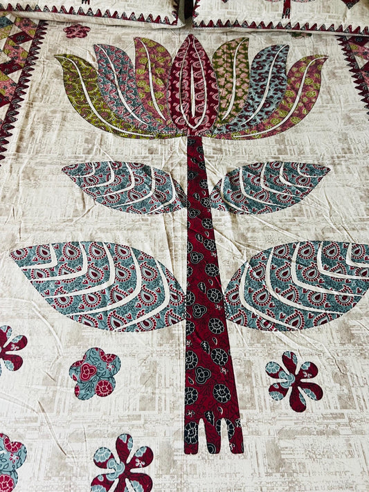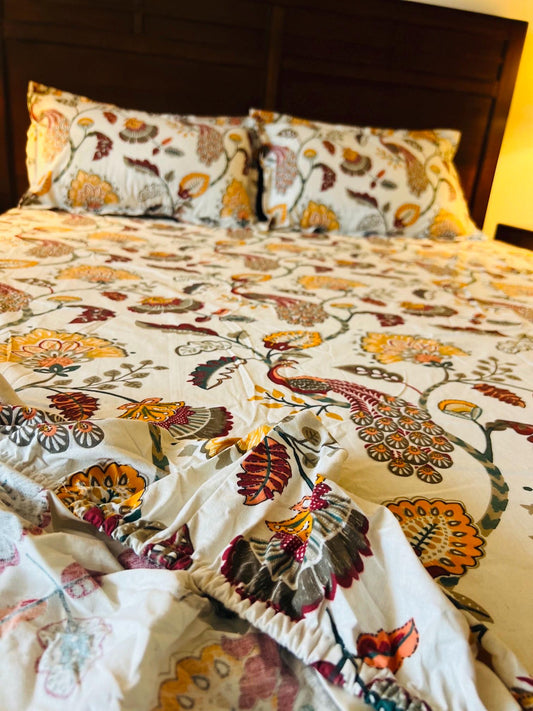 Handmade Peacock Floral Cotton Fitted sheet with Pillow Covers