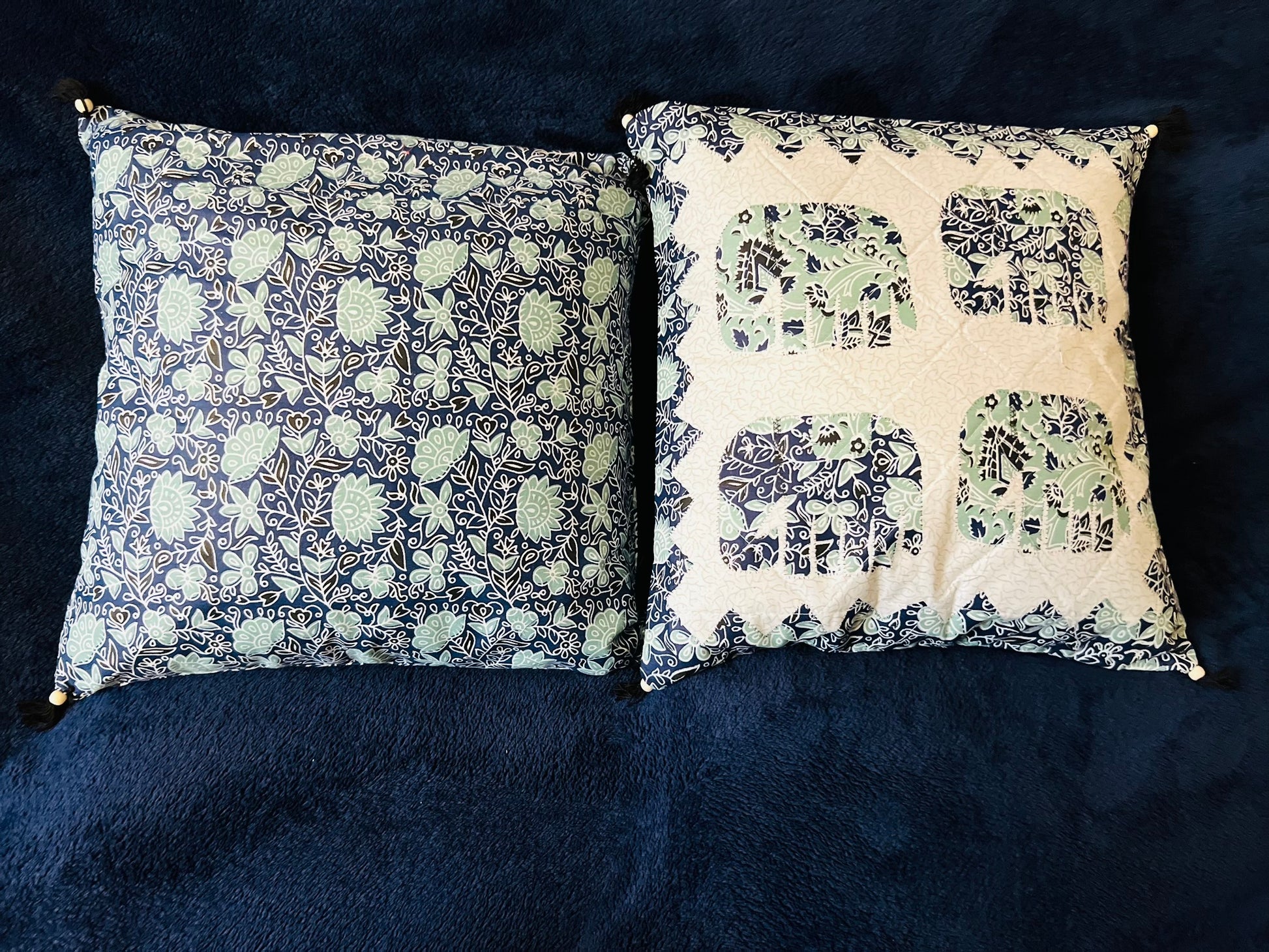 These organic cotton cushion covers feature traditional Jaipur block printing, with a reversible design featuring an elephant motif on the front and floral design on the back. The convenient opening flap makes it easy to change and the set of 2 is perfect for home decor.