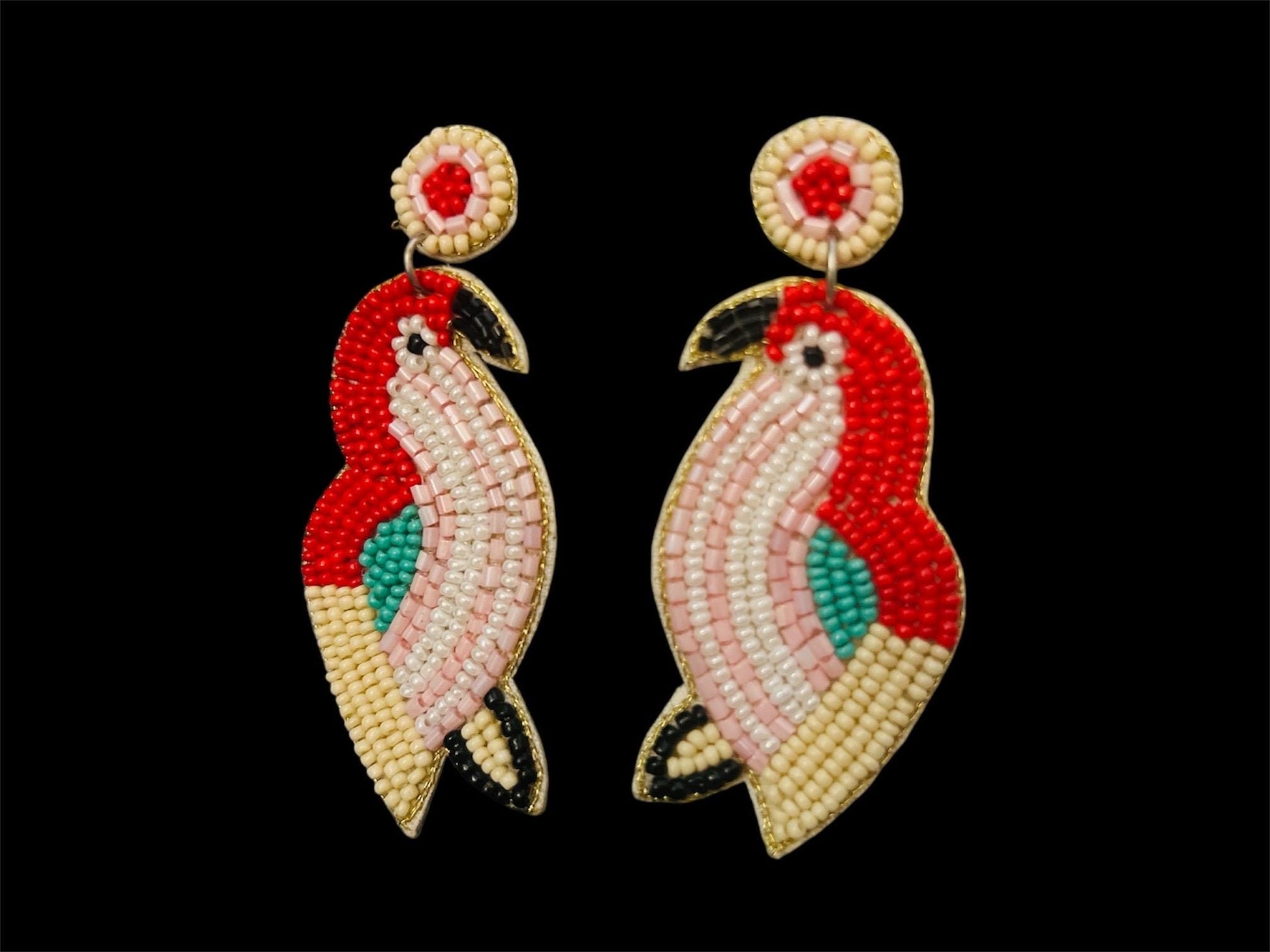 Brighten up your look with these stunning handcrafted beaded bird earrings! Featuring intricate beadwork in vibrant red, pink, cream, and teal tones, these earrings are designed to make a statement. Lightweight and comfortable, they add a playful yet elegant touch to any outfit.