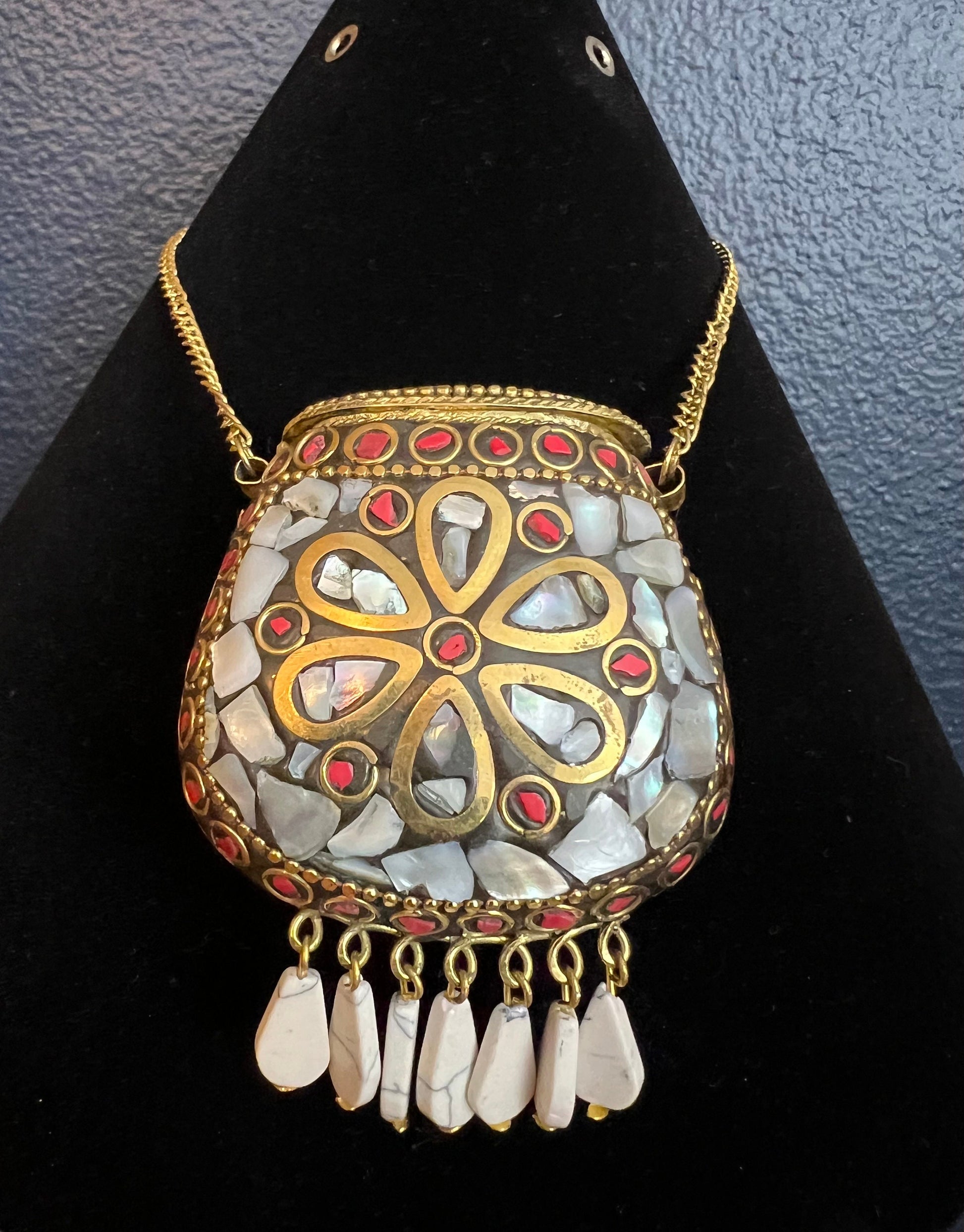 Tibetan/Nepalese Brass Gold Tone Inlay Chip White Stones Pendant