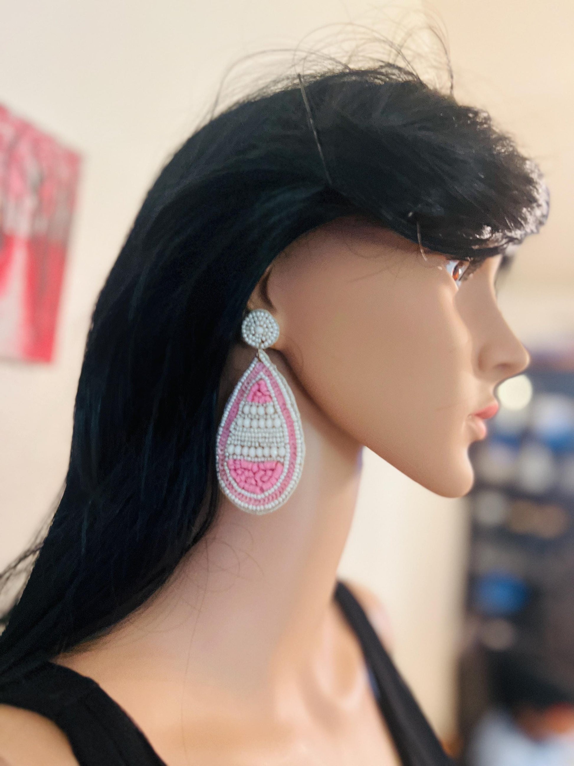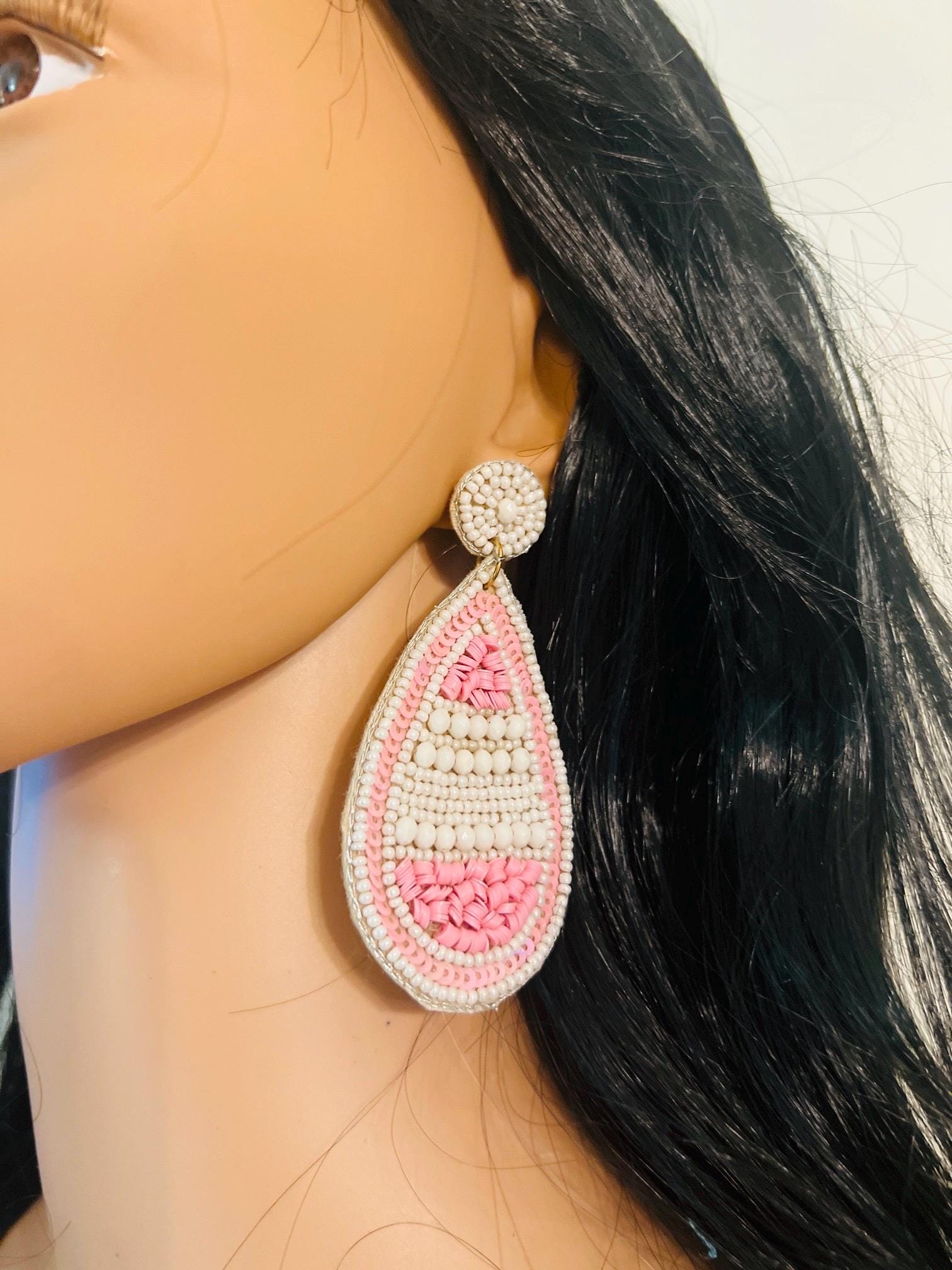 Elevate your style with these exquisite handmade beaded teardrop earrings in soft white and blush pink hues. Intricately crafted with delicate beads and sequins, these earrings make a bold yet elegant statement. Their lightweight design ensures all-day comfort, making them perfect for any occasion—whether it’s a wedding, a casual brunch, or a beach getaway.