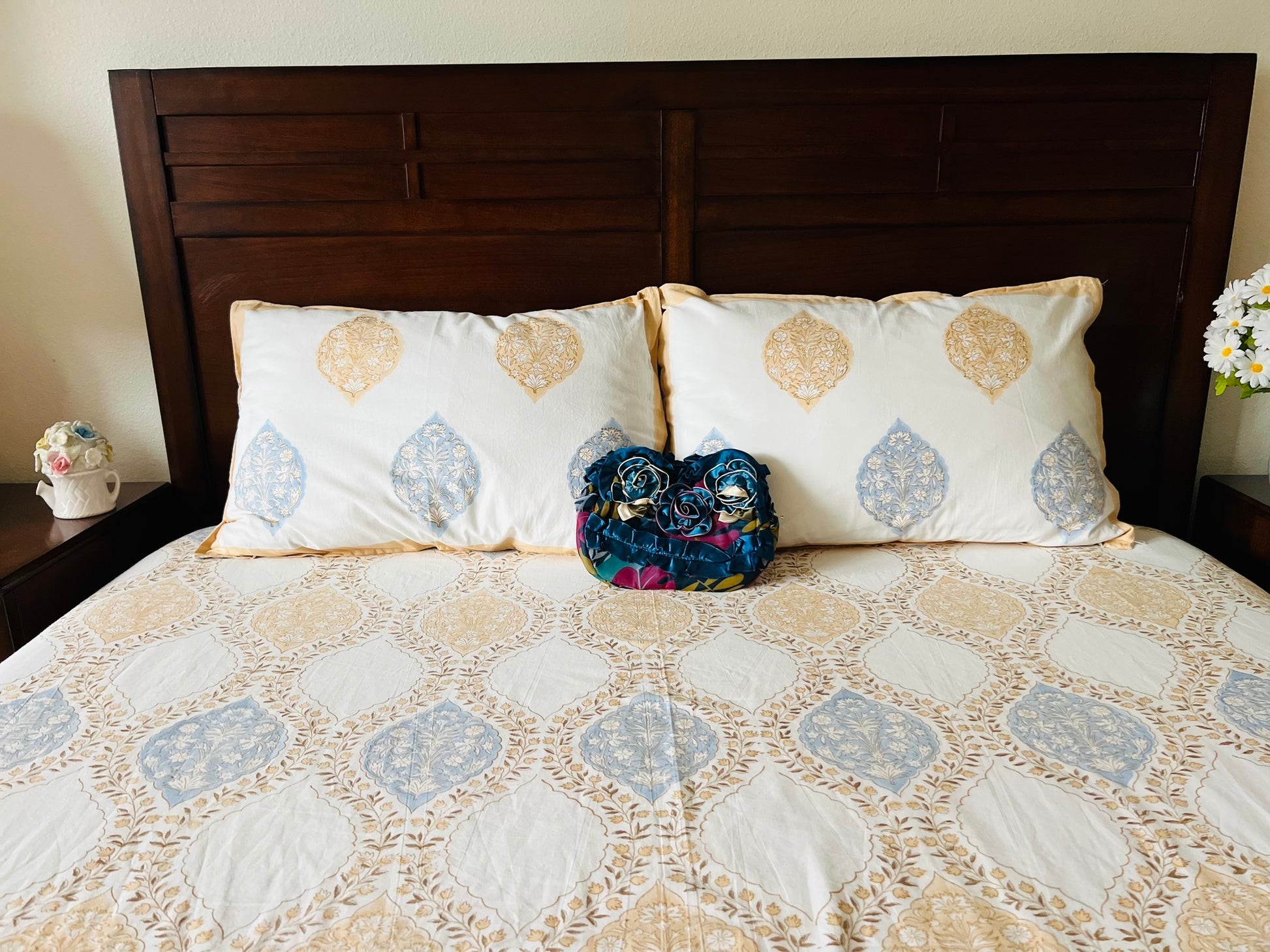 Elevate your bedroom decor with our Jaipur block print cotton bedsheet and pillow case set. Featuring a beautiful white and beige color design, you'll enjoy the softness of cotton while adding a touch of elegance to your bedding. Create a soothing and stylish oasis for a better night's sleep.