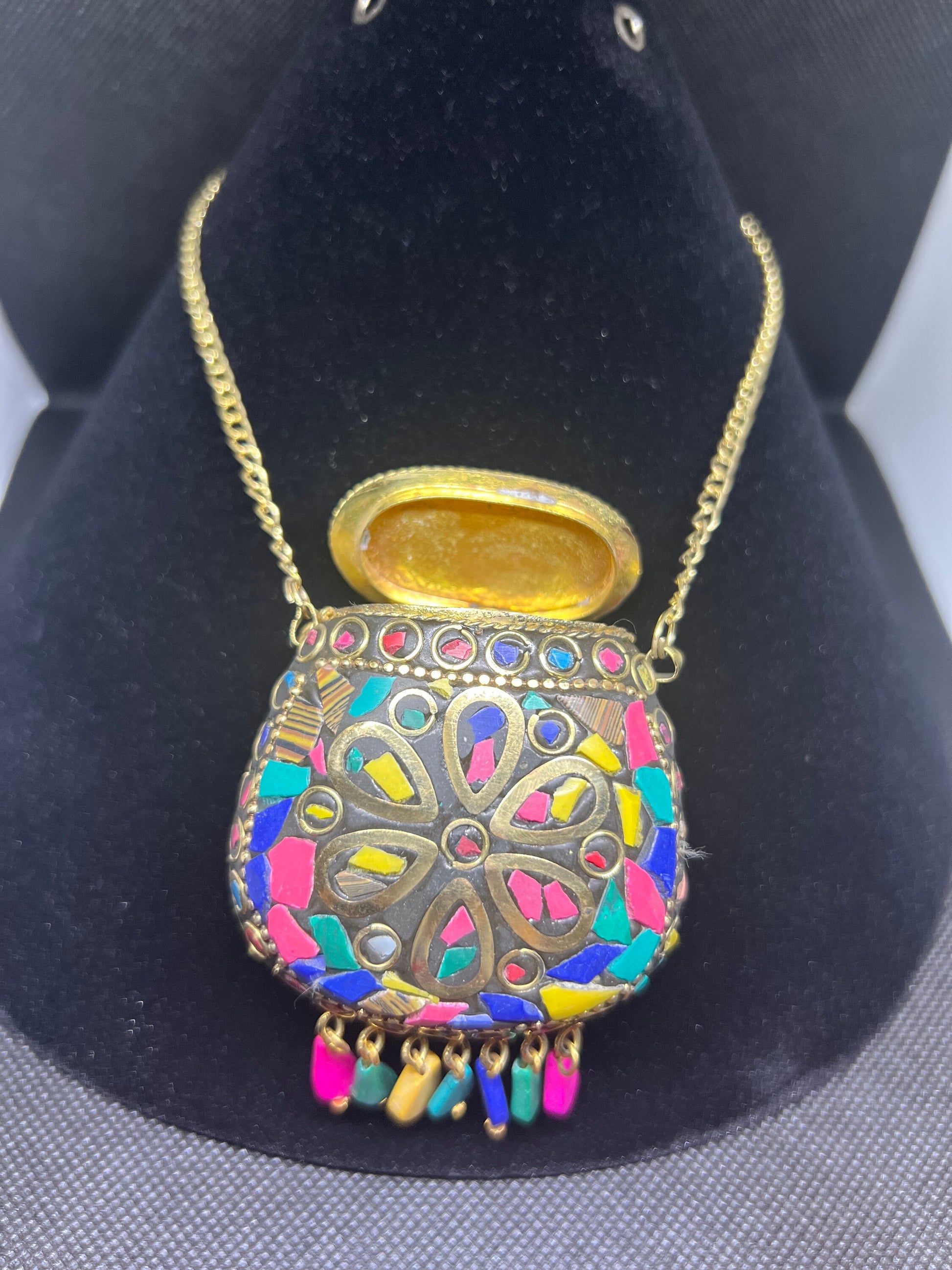 Multicolor Tibetan/Nepalese Brass Gold Tone Inlay Chip Stones Pendant