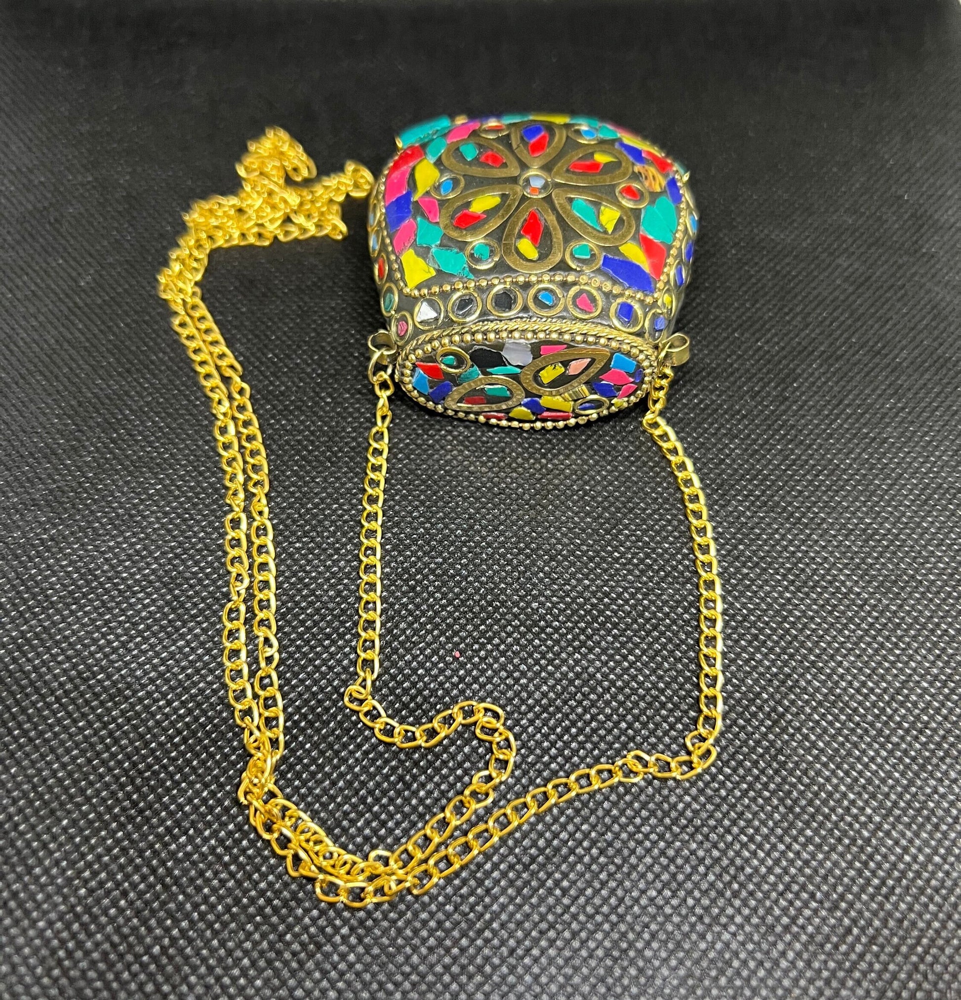 Indulge in the beauty of traditional craftsmanship and modern Bohemian elegance with our handmade Tibetan/Nepalese style brass gold tone inlay chip stones pendant. Each piece is lovingly crafted using time-honored techniques, ensuring a unique and exquisite finish that sets it apart from the rest. The combination of brass, chip stones, and a hanging tassel creates a captivating contrast, capturing attention and admiration wherever you go.